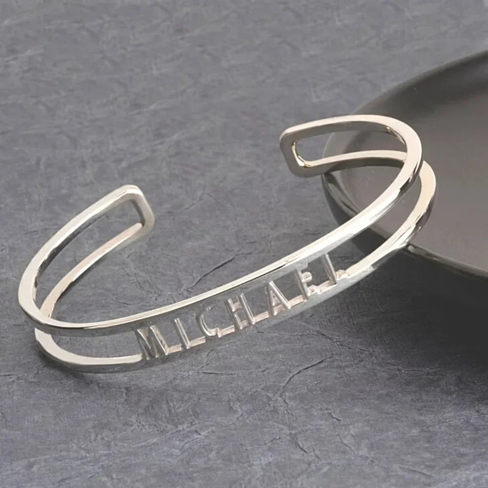Make a bold statement with the Cuff Name Bracelet in Gold, personalized with your name or favorite phrase. This Gold Cuff Bracelet is crafted from gold-plated stainless steel for lasting shine and comfort. Its adjustable design fits any wrist, offering a tailored look without compromising on ease. Wear it solo or stack it for a standout finish.