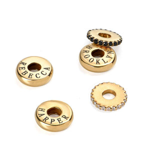 Keep your loved ones close with the Family Necklace with Engraved Names Gold. Each charm is a sleek, gold-finished ring that can be engraved with a meaningful name, date, or word, while sparkling cubic zirconia accents sit beautifully between them. A heartfelt keepsake that’s as stylish as it is personal, perfect for every day or special occasions.