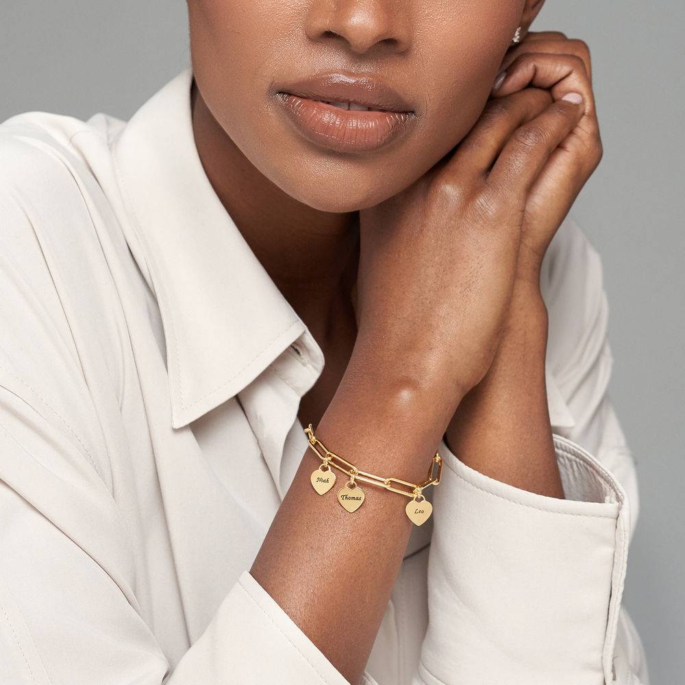 Personalize your Paperclip Charm Bracelet with up to six custom heart charms on this Rose Gold Bracelet with Engraved Charms. This Hearts Charms Paperclip Bracelet with rose gold finish is crafted from stainless steel with a waterproof finish for daily wear. Its modern paperclip chain balances bold style and comfort. Wear it solo or layer with other bracelets for a personalized look.